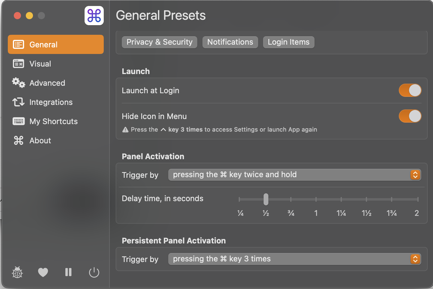 나의 셋팅은 command 더블클릭후 3초 유지할경우 단축키가 보이도록 설정하였다.