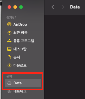 10. ํ์ธ > Finder์์ ์ผ์ชฝ ๋ฐ ํ์ธ {์์ ์ด ์ํ๋์ด๋ฆ} ์ด ์ถ๊ฐ ๋๊ฑฐ ํ์ธ (ex: Data)