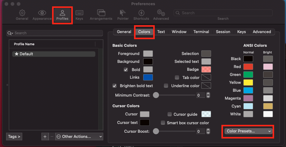iTerm2 > Preferences > Profiles (ํญ) > Colors (ํญ) ๊น์ง ์ด๋ > Color Presets