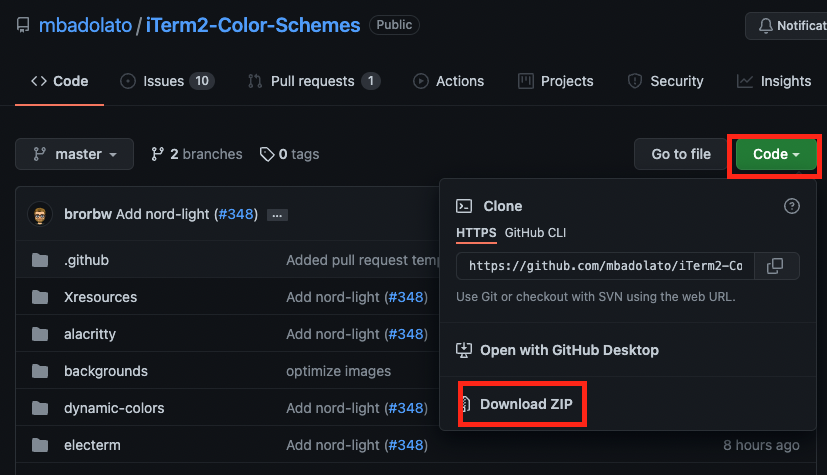 iTerm2 > Preferences > Profiles (ํญ) > Colors (ํญ) ๊น์ง ์ด๋ > Color Presets > import...