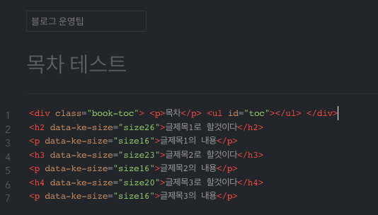 ์ค๋ฅธ์ชฝ ์ค์ท์ฒ๋ผ ํ๊ทธ๊ฐ ์ฝ์ ๋ ๋ถ๋ถ์ด ๋ณด์ผ ๊ฒ์ ๋๋ค. ์์ ํ๊ทธ๋ฅผ ๊ทธ๋๋ก ๋๋๊ณ ์ ์ฅํ๋ฉด ๋ชฉ์ฐจ๊ฐ ์ ์ฉ์ด ์๋ฉ๋๋ค.