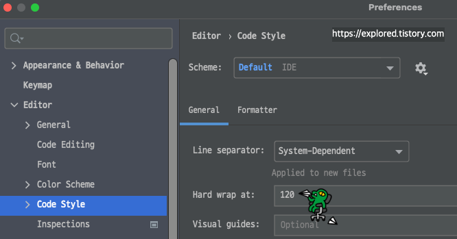 command + ,(์ค์ ) -> Code Style -> Hard Wrap at : 120 ์ค์