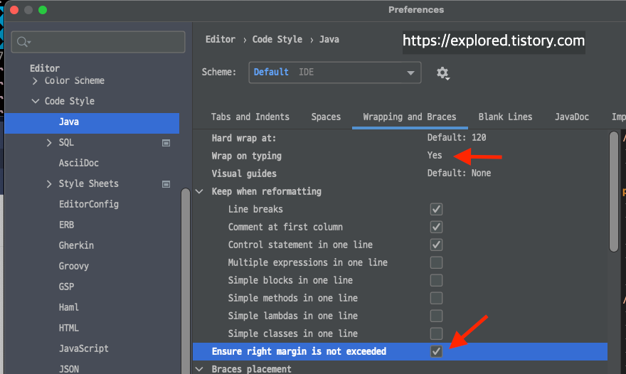 Code Style -> Java -> Wrapping and Braces -> Wrap on typing [Yes] && Ensure right margin is not exceeded [Check] ๋ฅผ ํด์ฃผ์ด์ผํฉ๋๋ค.