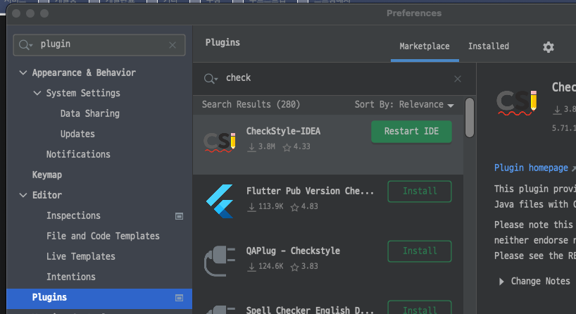 IntelliJ -> plugins -> checkstyle ๋ค์ด๋ก๋