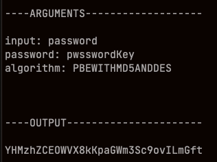 ./decrypt.sh input="YHMzhZCEOWVX8kKpaGWm3Sc9ovILmGft" password="pwsswordKey" algorithm="PBEWITHMD5ANDDES"