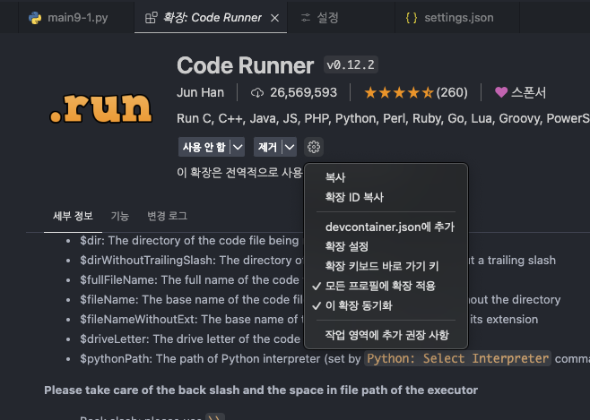 code runner -> ํ์ฅ ์ค์ -> Executor Map์์ ํ์ด์ฌ ์ต์ ๋ณ๊ฒฝ ๋!!