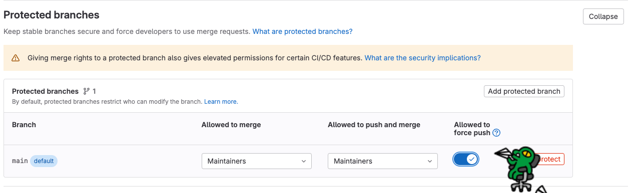 Setting -> Repository -> Protected branches -> Allowed to force push ๋ฅผ ์ผ์ฃผ์ธ์