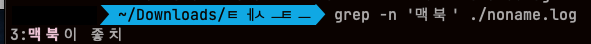 # noname.log ๋ผ๋ ํ์ผ๋ด์์ '๋งฅ๋ถ'์ด๋ผ๋ ํจํด์ด ๋ค์ด๊ฐ ๋ฌธ์์ด๊ณผ ํ๋ฒํธ๋ฅผ ์ถ๋ ฅ (-n ํ๋ฒํธ)
