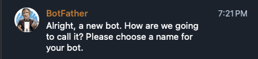 /newbot ์ ํด๋ฆญํ๋ฉด ์์ ๊ฐ์ด ๋ด ๋ค์์ ์ ํ๋ผ๊ณ ํ๋ค. bot ๋ค์์ ์๊ธฐ๊ฐ ์ํ๋ ์๋ฌด ์ด๋ฆ ์ด๋ ์์ฑํด์ ์ํฐ๋ฅผ ๋๋ฅด๋ฉด